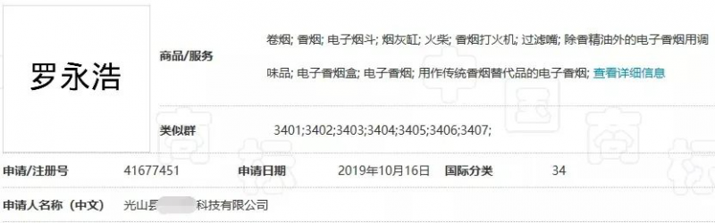 据商标局官网显示,2019年10月16日,光山县XXX科技有限公司(下称光山县公司)注册“罗永浩”商标,类别为烟草,目前该商标处于等待实质审查的阶段。