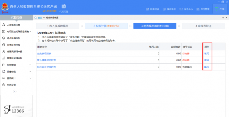 1收入及减除填写】中如果填写了"减免税额"、“商业健康保险""税延养老保险”需要在【3附表填写】中完善附表信息。